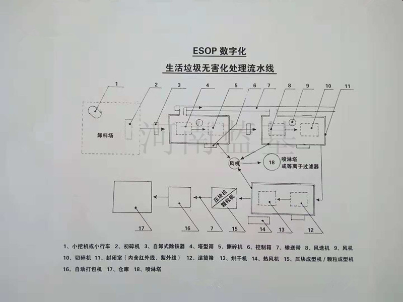 藍(lán)基生活垃圾無(wú)害化處理生產(chǎn)線實(shí)現(xiàn)生活垃圾零污染二次再利用,搗切初碎(原理:機(jī)體配置多種形式刀片,分上下兩級(jí),多方面搗切生活垃圾內(nèi)任何物質(zhì)搗切成片狀后利用機(jī)體自壓排入下道工序)→輸送與金屬分選→利用高壓氣流吸推進(jìn)行二次粉碎(原理:動(dòng)態(tài)錘片和動(dòng)態(tài)刀片組合,在靜態(tài)刀片的協(xié)調(diào)動(dòng)作下進(jìn)行運(yùn)轉(zhuǎn),達(dá)到粉碎后,通過高壓氣流的吸推把物料排出下道工序)→殺菌絞龍(原理:利用鏍族葉片搗動(dòng),在封閉狀態(tài)下通過經(jīng)外線產(chǎn)生高溫進(jìn)行無(wú)二次污染的殺菌消毒)→鏍旋烘干、無(wú)機(jī)物分離(原理:利用鏍旋葉片搗動(dòng)、輸送,在封閉狀態(tài)下進(jìn)行無(wú)任何環(huán)境污染的烘干處理)→可回收利用原料(用于建筑用板材、工業(yè)包裝板材、煙花組合筒基材等其他產(chǎn)品)→生物質(zhì)燃燒顆粒(經(jīng)檢測(cè)熱值達(dá)4500達(dá)卡左右,用于代煤燃燒發(fā)電和鍋爐代煤)。