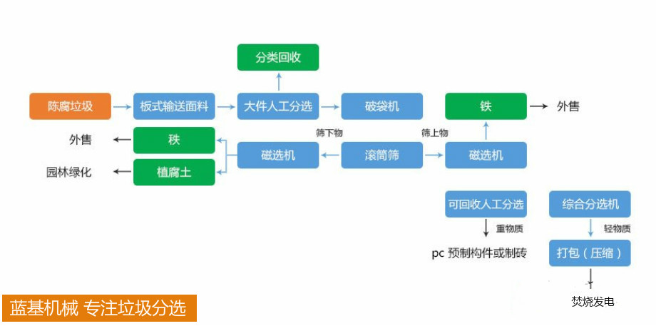 通過滾筒篩分機(jī)將陳腐垃圾分為篩下物、篩上物兩部分,其中篩下物經(jīng)磁選機(jī)選出鐵磁物,其他物料成為腐殖土;篩上物經(jīng)過磁選機(jī)選出鐵磁物,其他物料輸送至綜合風(fēng)選設(shè)備。