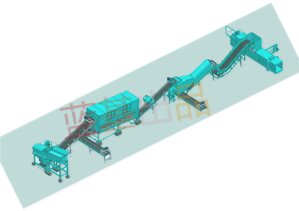 篩上物在散料滾筒篩和可調(diào)風(fēng)量、風(fēng)速的風(fēng)機(jī)作用下將輕物分離。重物料由輸出機(jī)輸出用于建筑砌塊;輕物壓縮外運(yùn)焚燒發(fā)電。