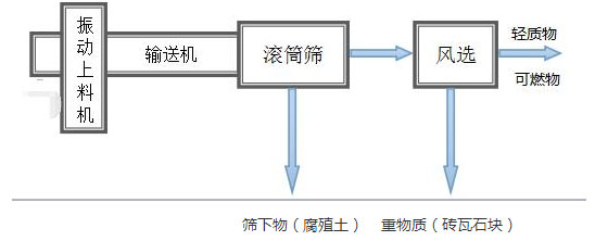 礦化垃圾(陳腐垃圾)由挖掘機(jī)挖出直接給振動(dòng)上料機(jī)上料或通過(guò)裝載機(jī)給振動(dòng)上料機(jī)上料,振動(dòng)上料機(jī)的篩分粒徑為200mm,200mm以上的物料主要是大石塊和建筑垃圾,由振動(dòng)上料機(jī)選出。